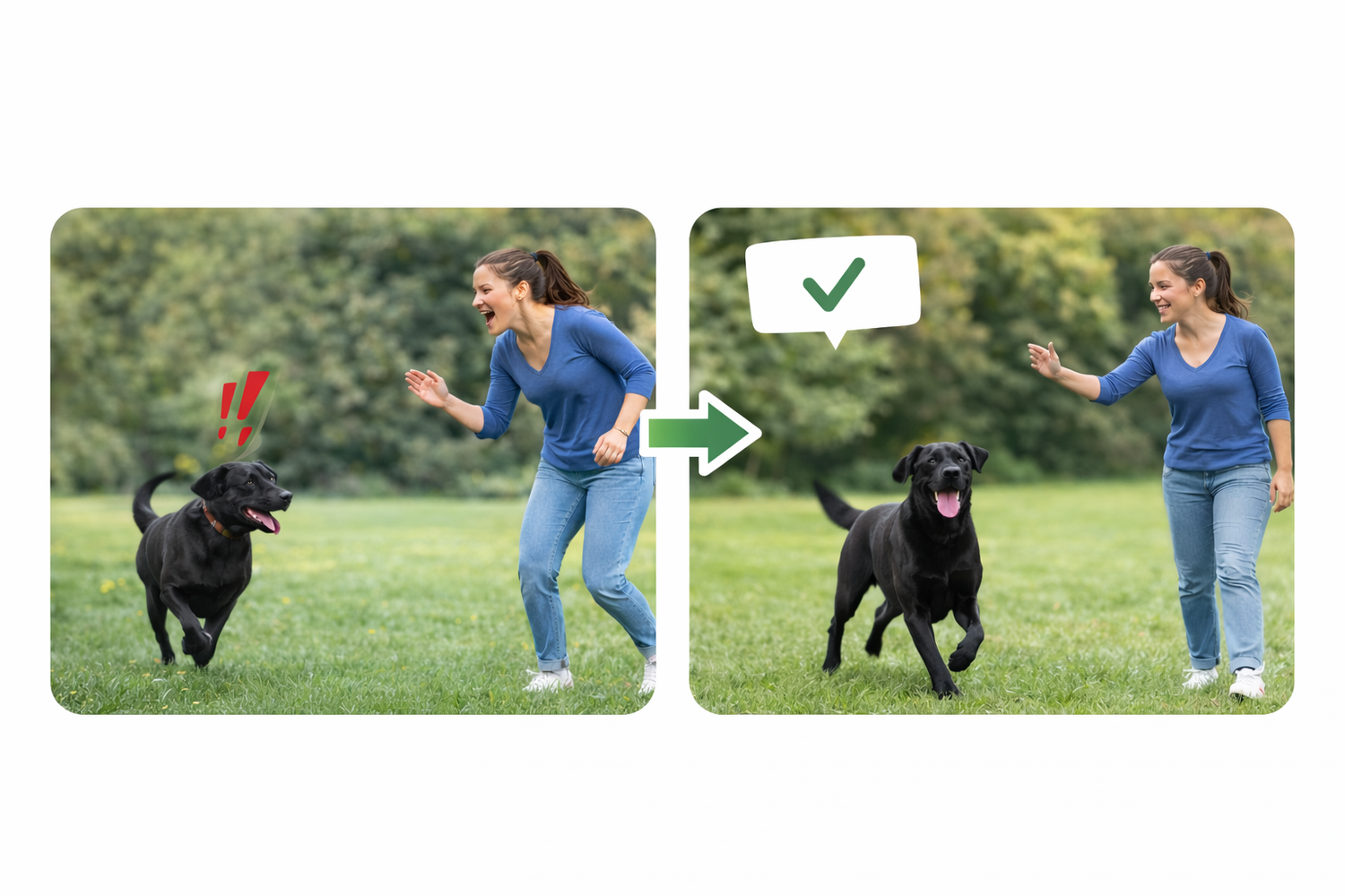 ❌ Pies ignoruje komendę „DO MNIE”, co prowadzi do frustracji, krzyków i braku kontroli.